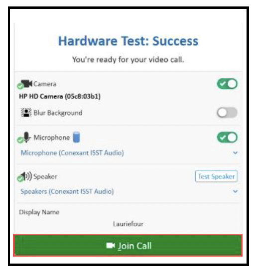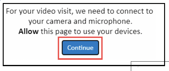 Complete a hardware test to make sure your device’s camera, microphone and speakers are working prior to joining the video visit. Then select “Join Call.” ( See visual)