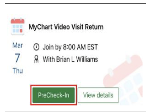 Complete the PreCheck-In process by opening the MyChart app, logging in and choosing “PreCheck-In” next to the video visit appointment.